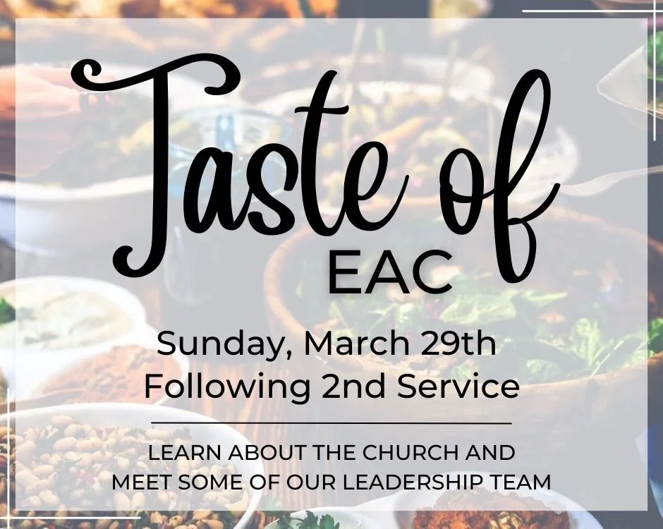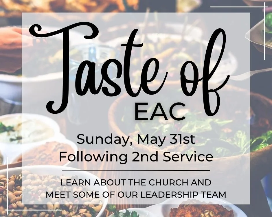 Making disciples who bring the Gospel to every man, woman, and child Register Wishlist Welcome!Join us on campus Sundays at 9:00am or 10:30am, or watch on Facebook, Youtube, or here at 10:30am. Ministries Kids Students Young Adults Women Seniors Subscribe to the EAC Newsletter * indicates required Email Address *First Name *Last Name *